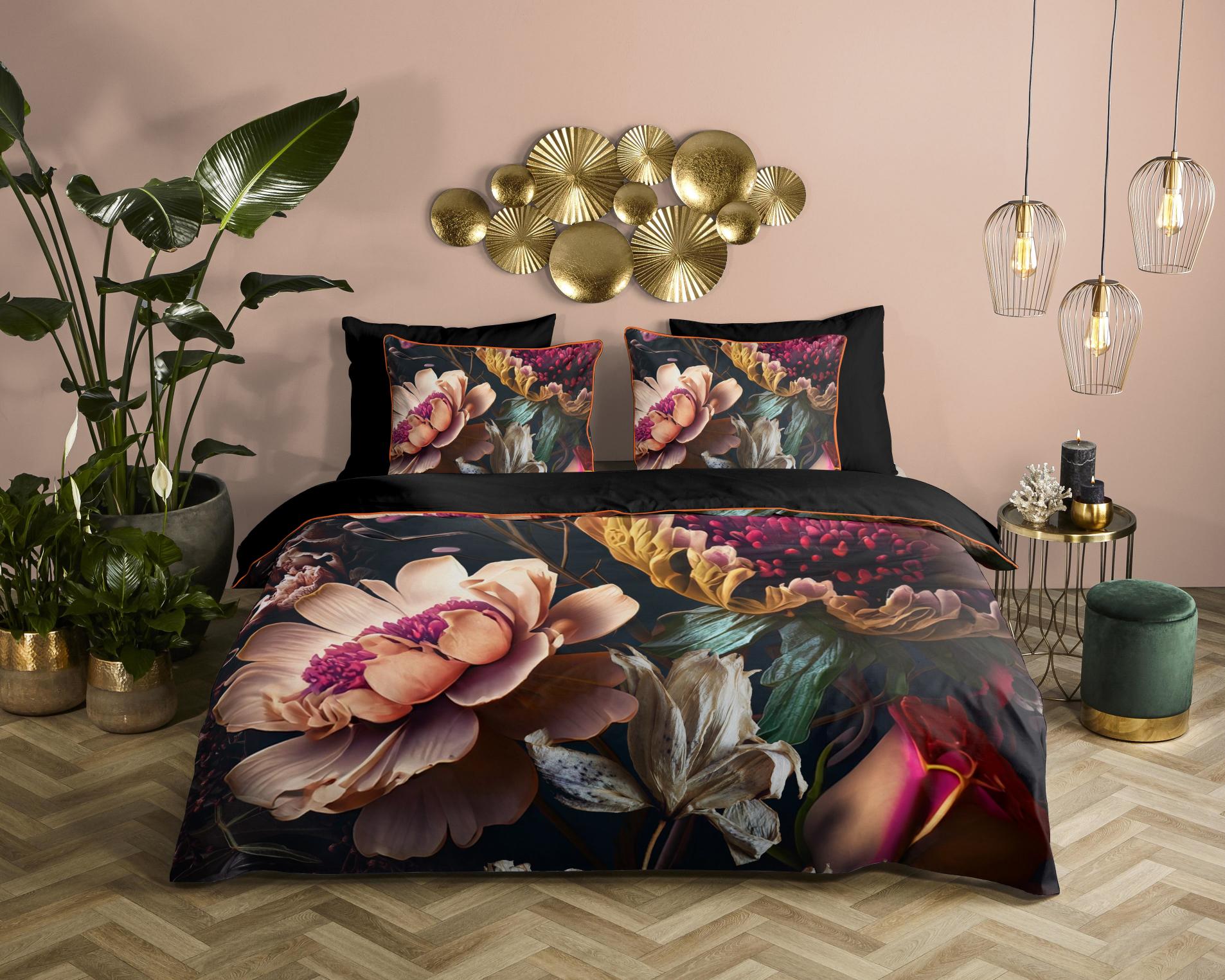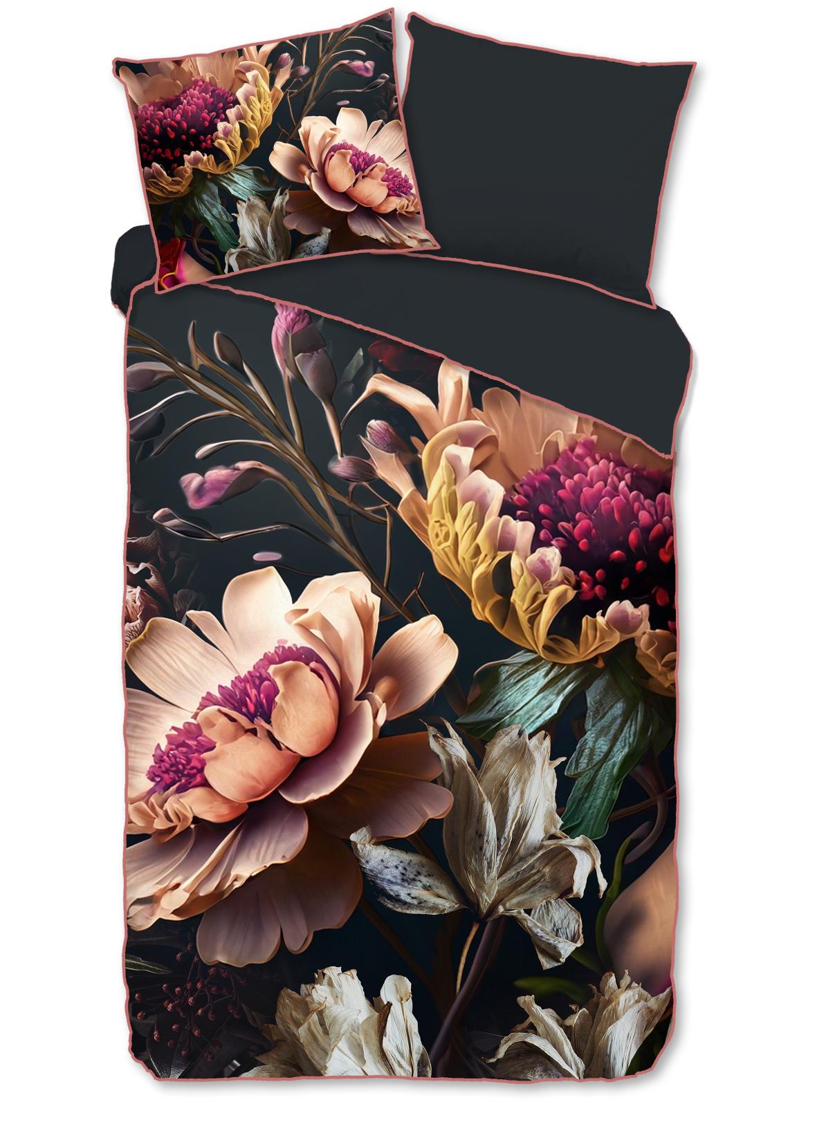 Housse de couette en satin Straizo de Descanso. Cette housse de couette avec des fleurs, de couleur anthracite, est faite de 100% coton-satin. La housse de couette Descanso est luxueuse, élégante et stylée. Le dos a une couleur unie assortie.
