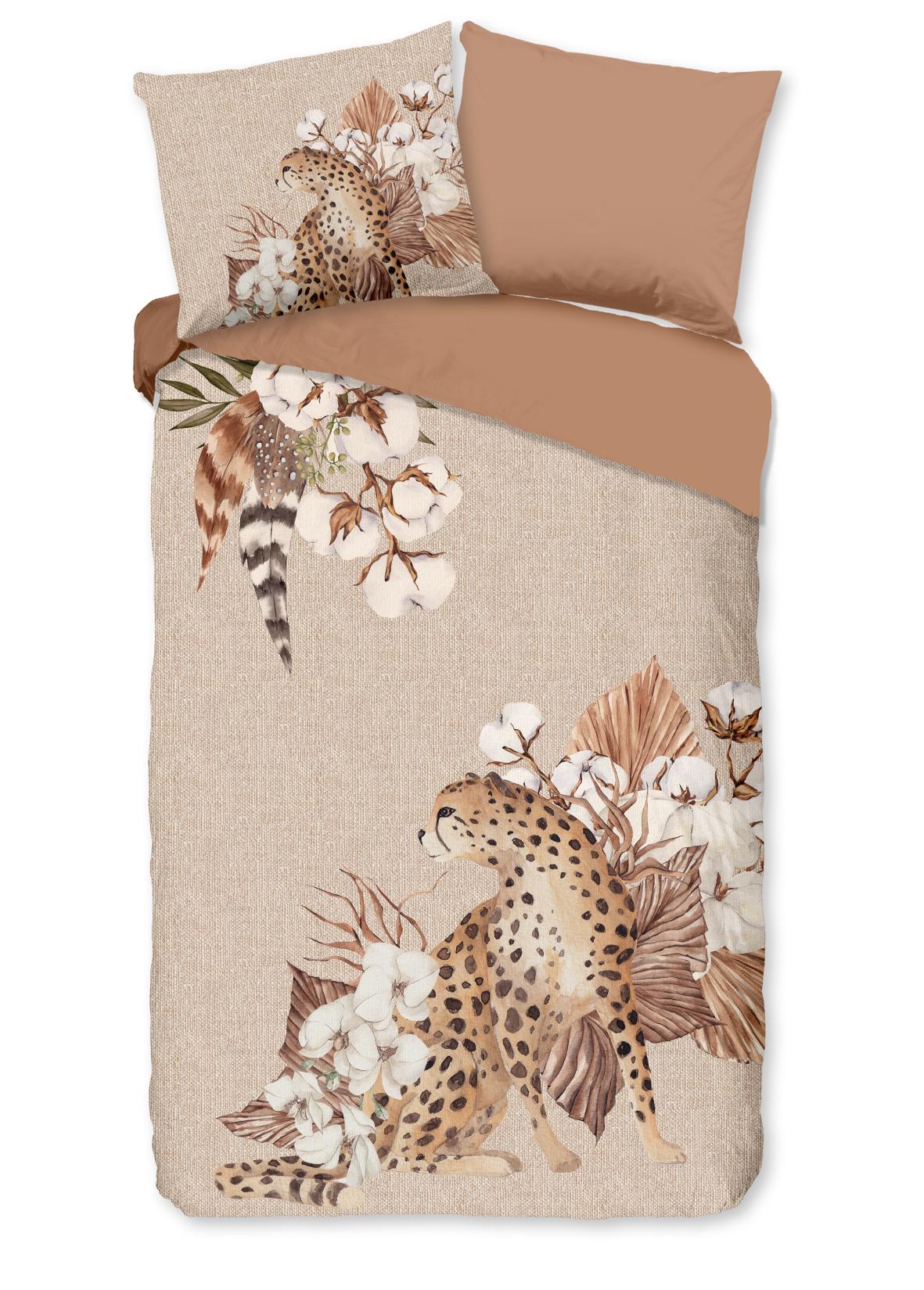 Housse de couette en flanelle Chevy de Good Morning, en couleur sable, avec un imprimé de tigre et de fleurs. La housse de couette est faite de 100% coton/flanelle légèrement brossé, créant une couche douce comme du velours qui est agréablement chaude - parfaite pour les nuits froides.