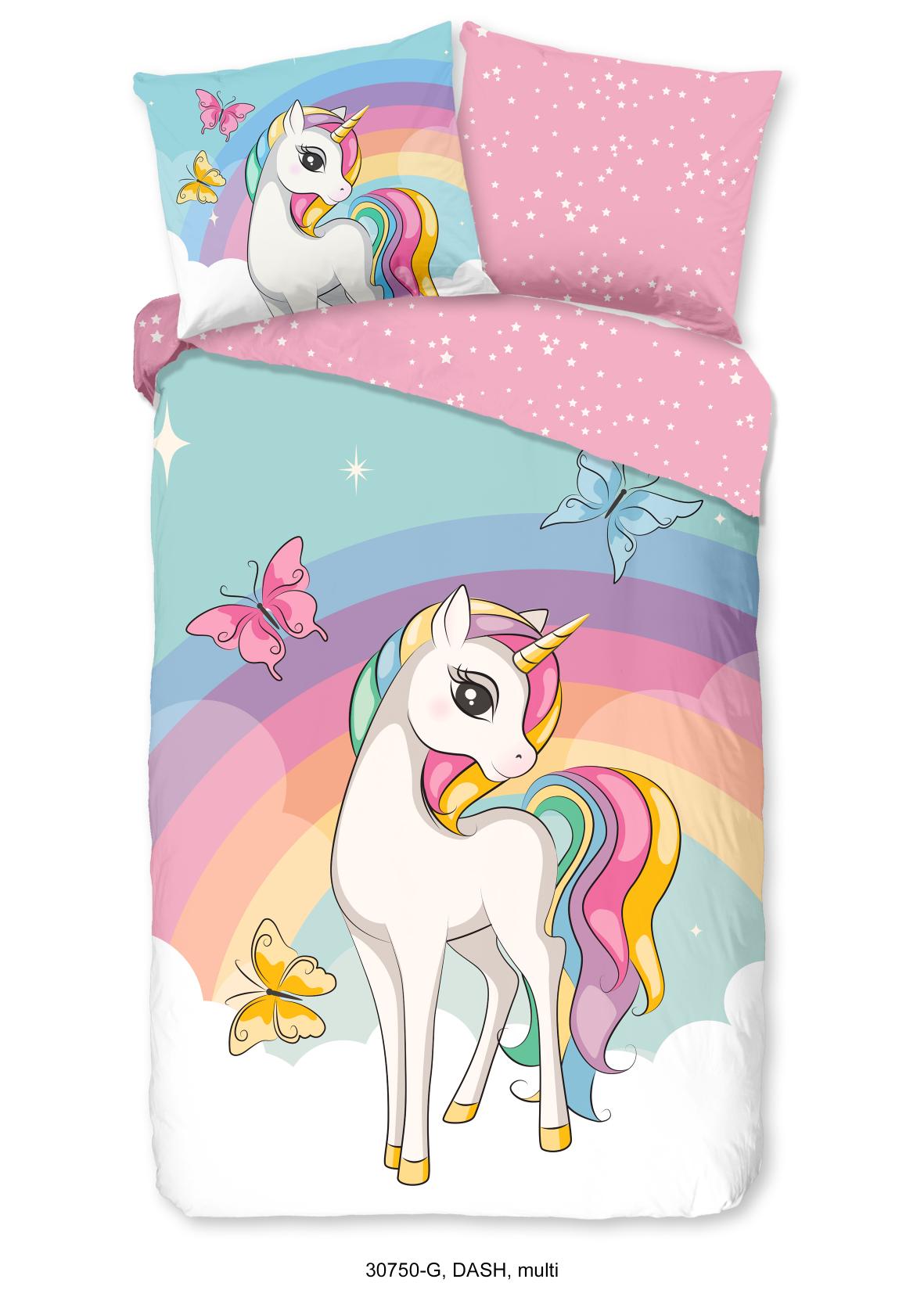Housse de couette pour enfants Dash de Good Morning en couleur multi, avec un imprimé de licorne et arc-en-ciel. La housse de couette est faite de 100% coton. Cette qualité est respirante, absorbante et douce au toucher. Cette jolie housse de couette pour enfants est un ajout amusant à toute chambre d'enfant. La housse de couette pour enfants est adaptée à toutes les saisons. Le coton 100% est agréablement frais en été et procure de la chaleur en hiver. Cet article est certifié Oeko-Tex (Oeko-Tex Standard 100) : exempt de substances nocives et respectueux de la peau. Lavable à max. 40°C et adapté au sèche-linge.