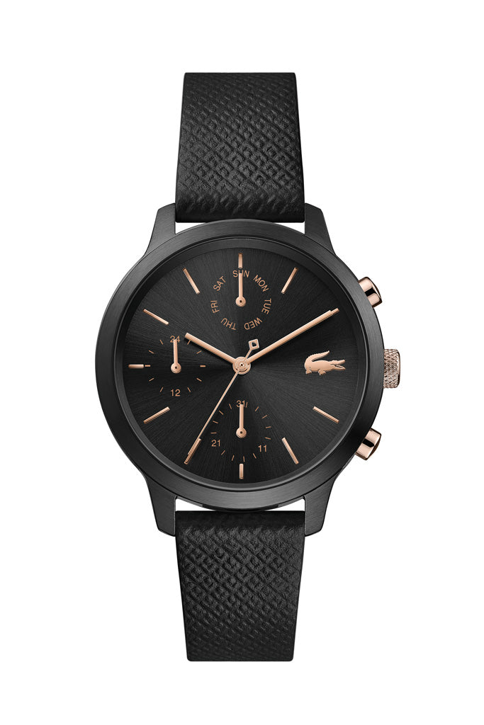 zwarte leren band - zwarte pvd kast - zwarte wijzerplaat - 36 mm