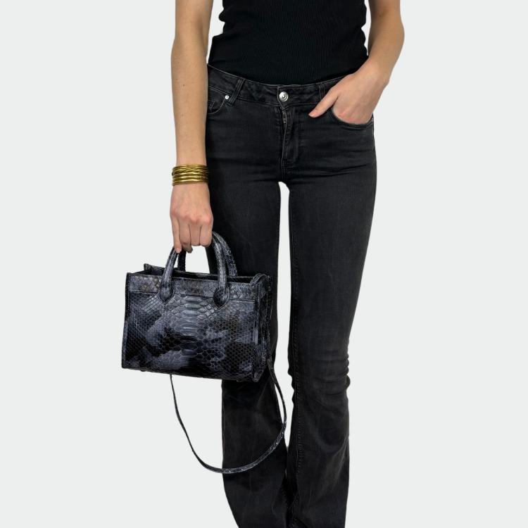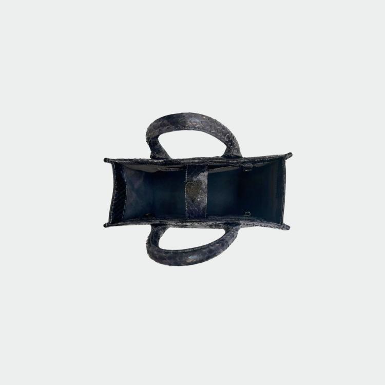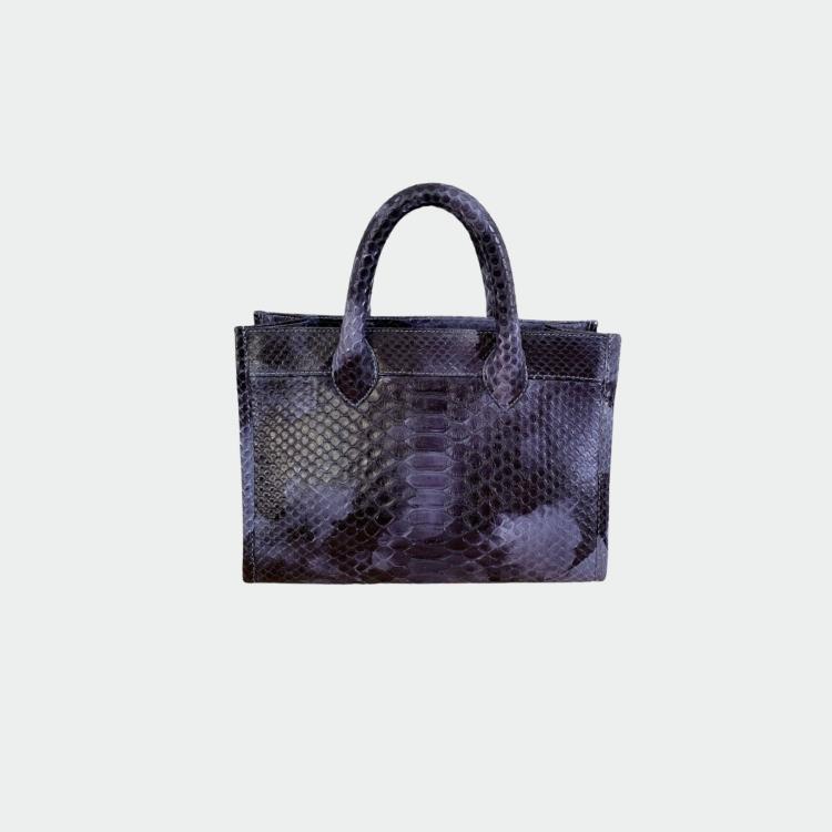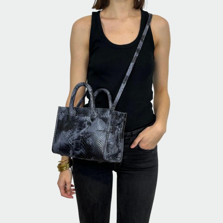 Sac en python, avec doublure intérieure encoton et anses rigides. Un compartimentprincipal avec une petite poche et une poche zippée.Bandoulière amovible en python.Dimensions du sac : 31 x 13,5 cm