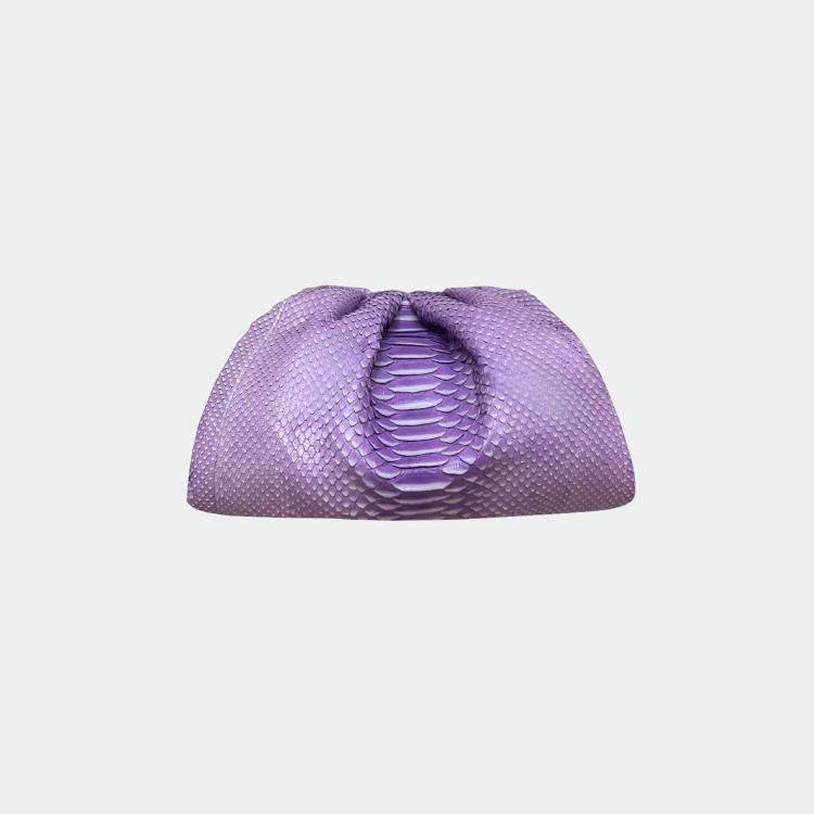 Pochette souple en python, avec doublure intérieure en coton et fermeture magnétique. Compartiment unique avec petite poche. Finitions métalliques. Bandoulière amovible en python.