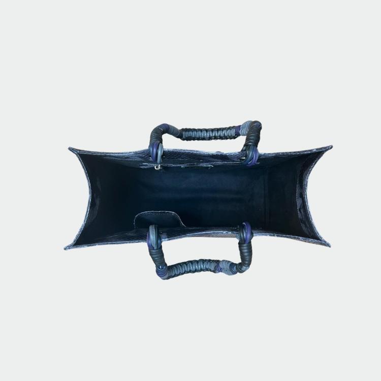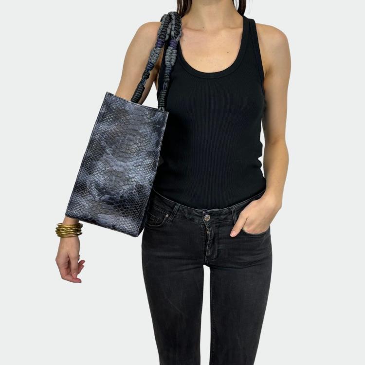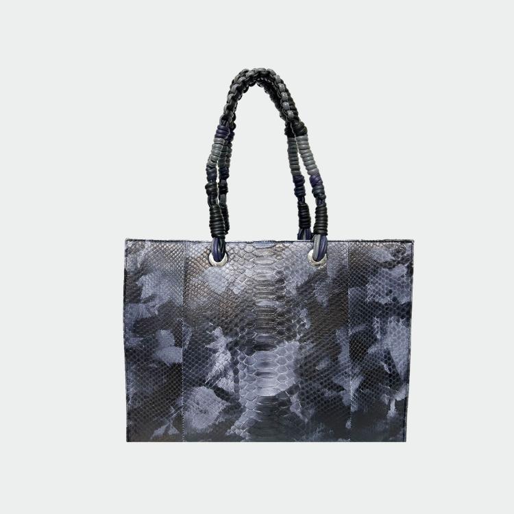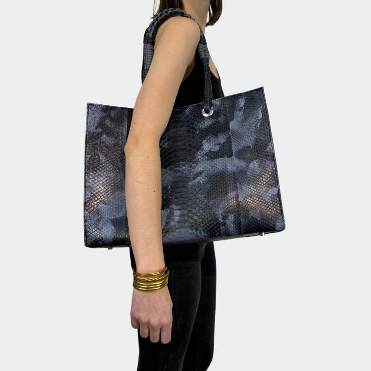 Sac en python, avec doublure intérieure en coton et anses tressées.