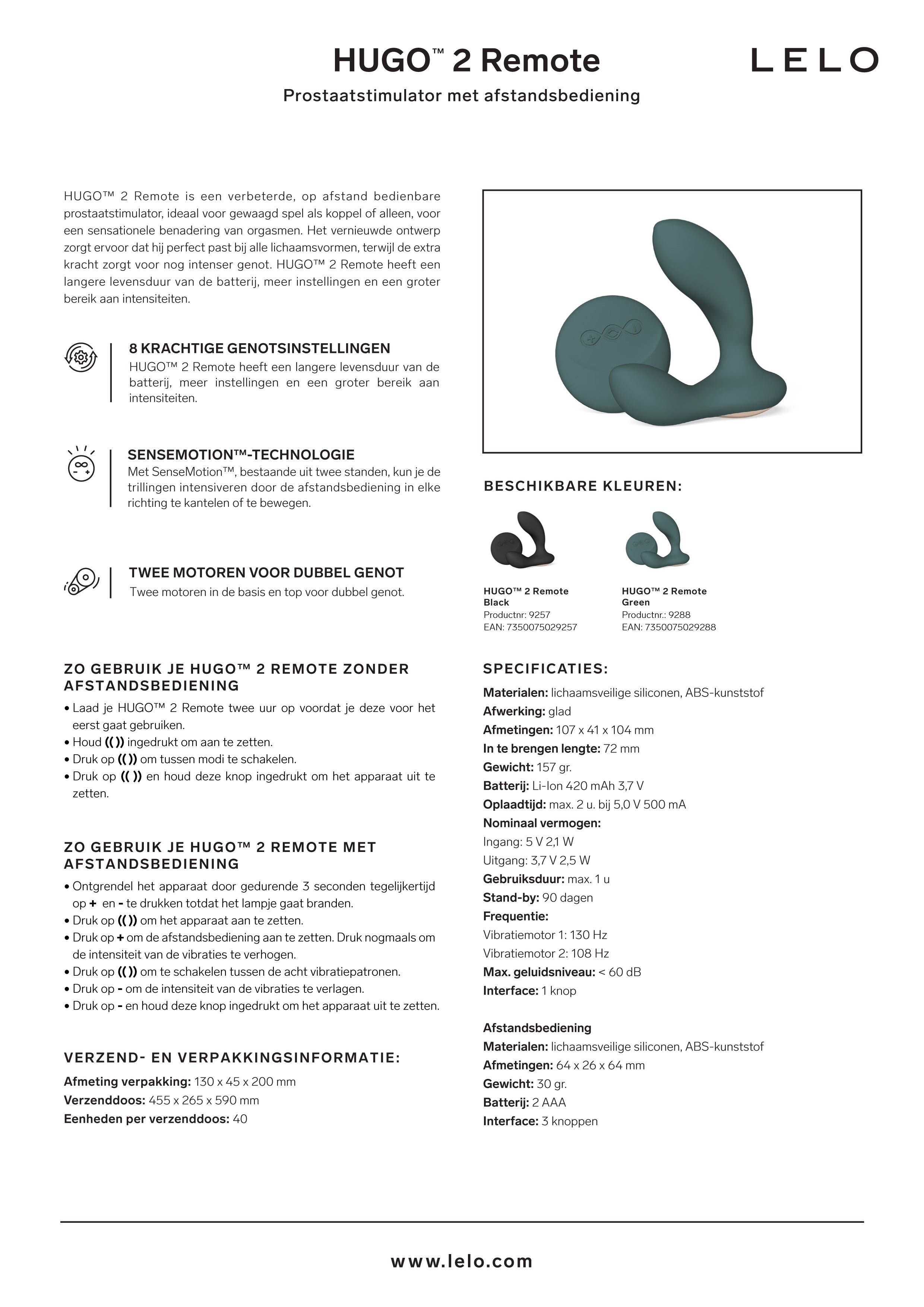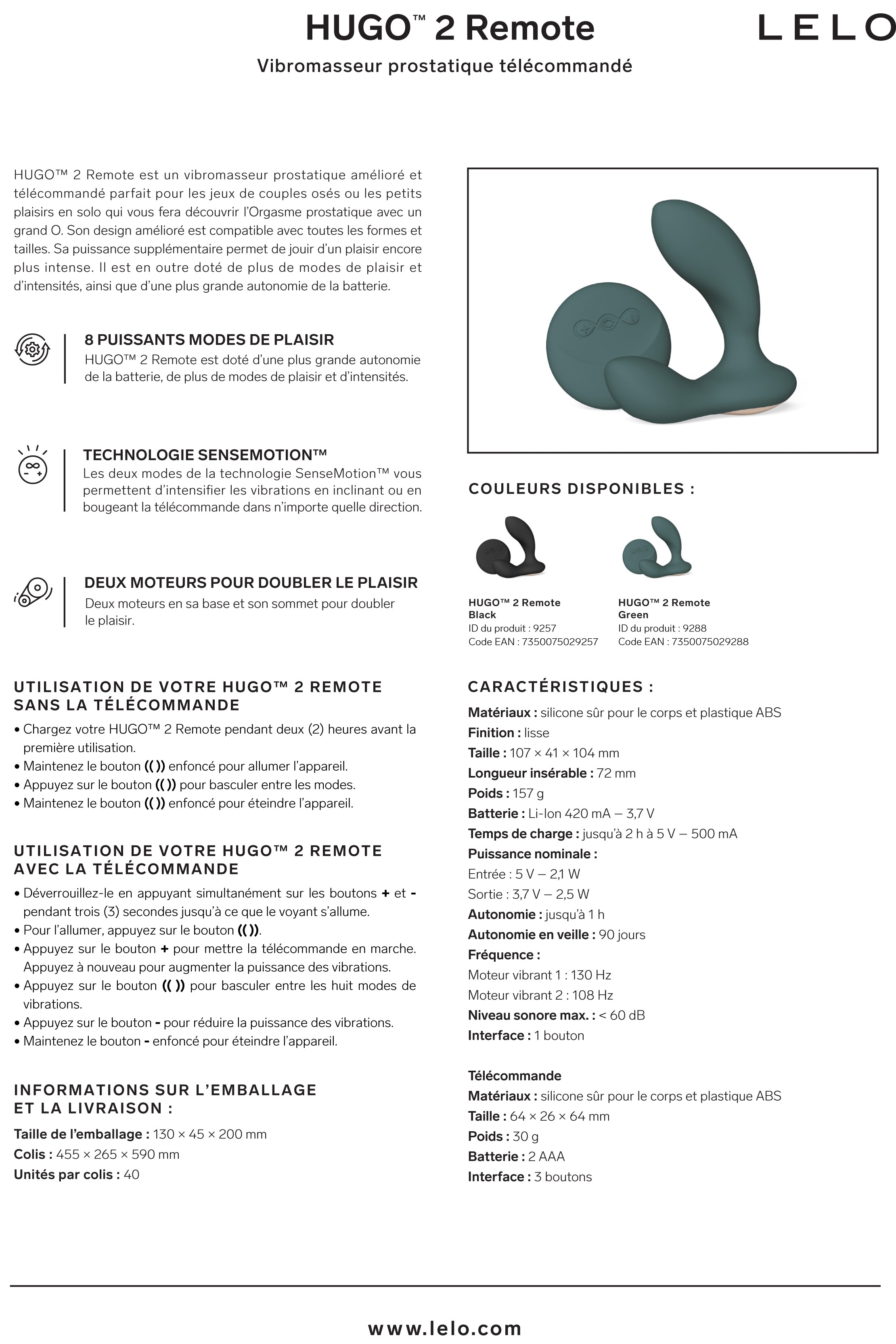 HUGOTM 2 est un élégant vibromasseur prostatique au design repensé connecté à une application et désormais doté de 10 modes de plaisir spectaculaires. En outre, il a une plus grande autonomie, ce qui permet de stimuler la prostate encore et encore. Compatible avec l’application LELO, les utilisateurs ont un meilleur contrôle de leur appareil et peuvent ajouter des modes de plaisir supplémentaires.