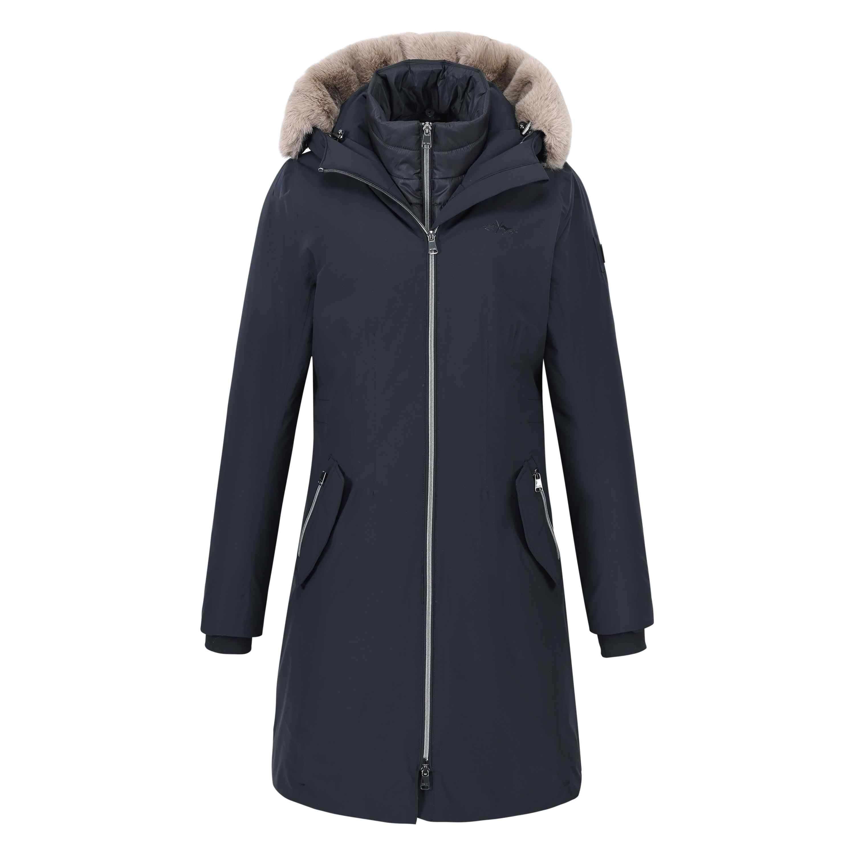 Parka élégante à rembourrage moyen * Col montant * Fourrure de luxe autour de la capuche * Veste intérieure amovible en tissu brillant perle * Capuche ajustable * Coutures entièrement étanchées * Déperlant * Coupe-vent * Fermeture éclair à double sens à l'avant * Tirettes de marque * Doublure contrastée * Étiquette Fakedown imprimée brillante à l'intérieur de la veste sur la doublure * Poignets intérieurs en fine côte * Protège-menton * Poches avant avec rabat et fermetures éclair * Fentes latérales avec boutons-pression invisibles * Poche intérieure avec fermeture éclair * Logo HV Polo imprimé en métal sur la poitrine côté gauche du porteur * Accessoires métalliques noirs * Plaque de chevaux métallique sur la manche supérieure côté gauche du porteur