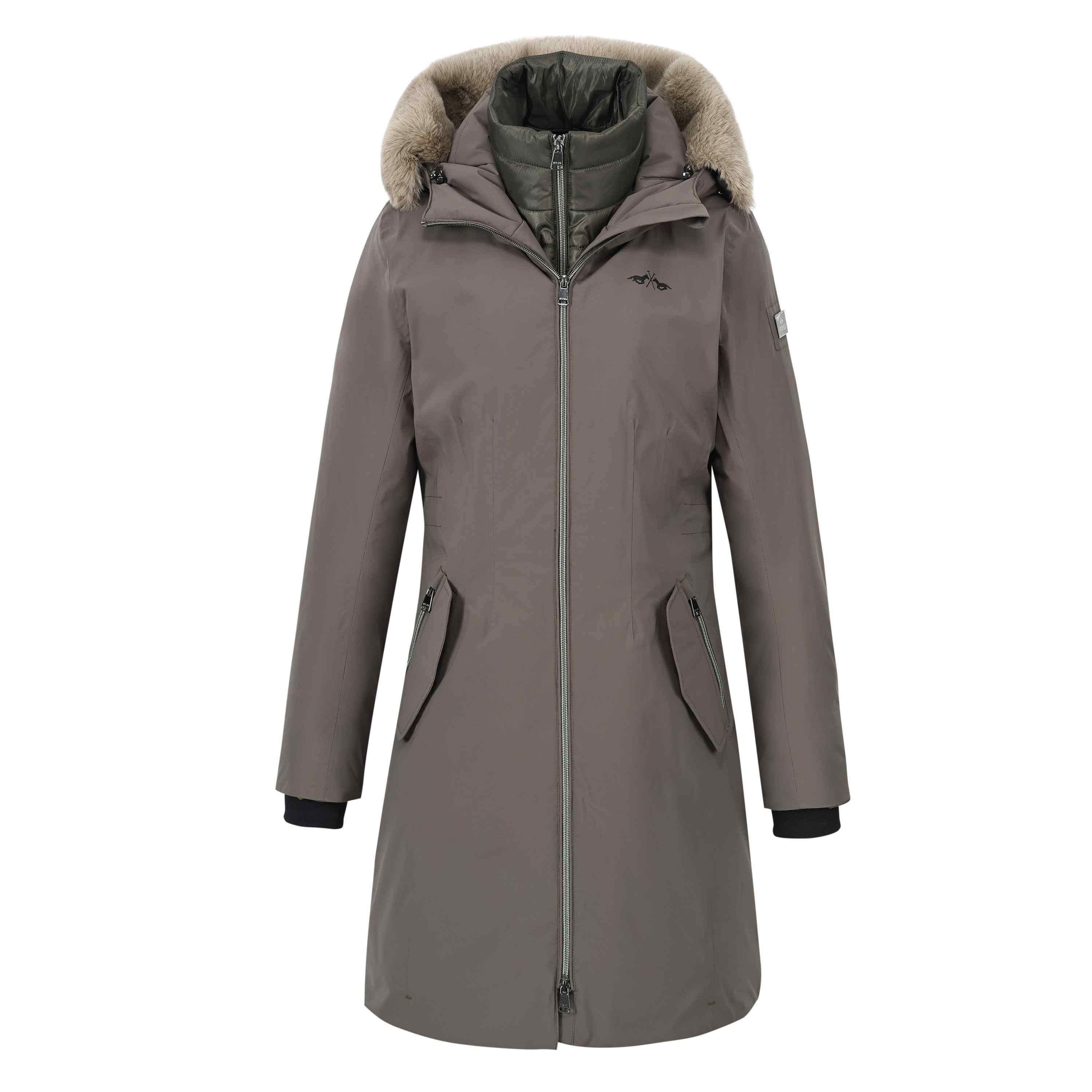 Parka élégante à rembourrage moyen * Col montant * Fourrure de luxe autour de la capuche * Veste intérieure amovible en tissu brillant perle * Capuche ajustable * Coutures entièrement étanchées * Déperlant * Coupe-vent * Fermeture éclair à double sens à l'avant * Tirettes de marque * Doublure contrastée * Étiquette Fakedown imprimée brillante à l'intérieur de la veste sur la doublure * Poignets intérieurs en fine côte * Protège-menton * Poches avant avec rabat et fermetures éclair * Fentes latérales avec boutons-pression invisibles * Poche intérieure avec fermeture éclair * Logo HV Polo imprimé en métal sur la poitrine côté gauche du porteur * Accessoires métalliques noirs * Plaque de chevaux métallique sur la manche supérieure côté gauche du porteur
