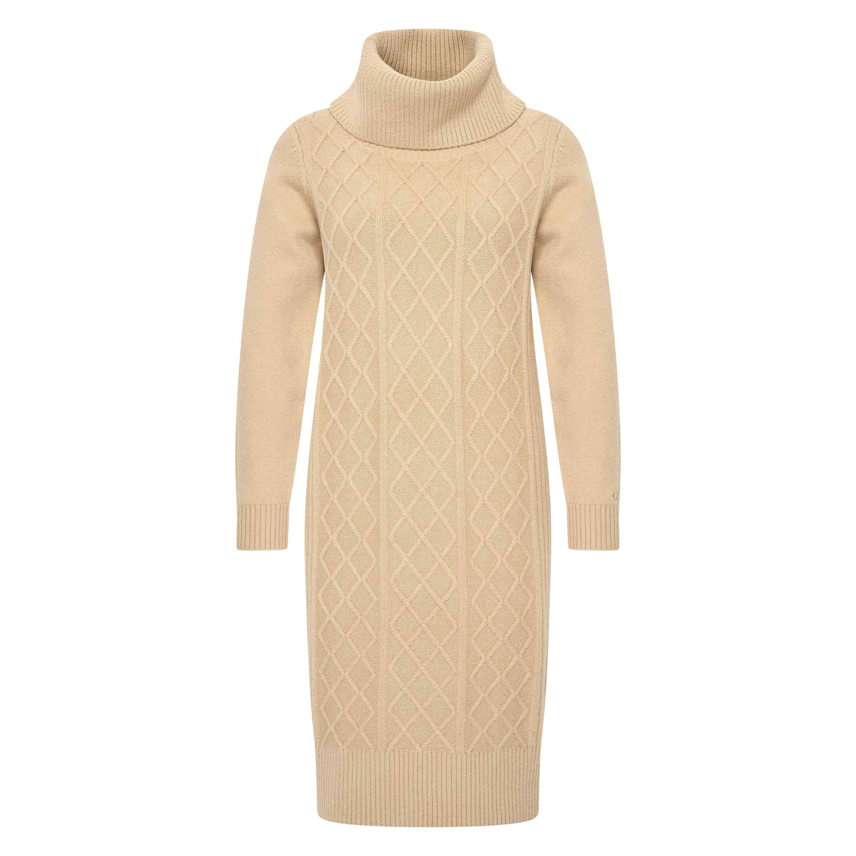 * Robe en tricot * Mélange de différents motifs torsadés à l'avant * Côtes aux poignets, à l'ourlet du bas et au col * Grand col roulé * Plaque en métal de marque à l'arrière du cou