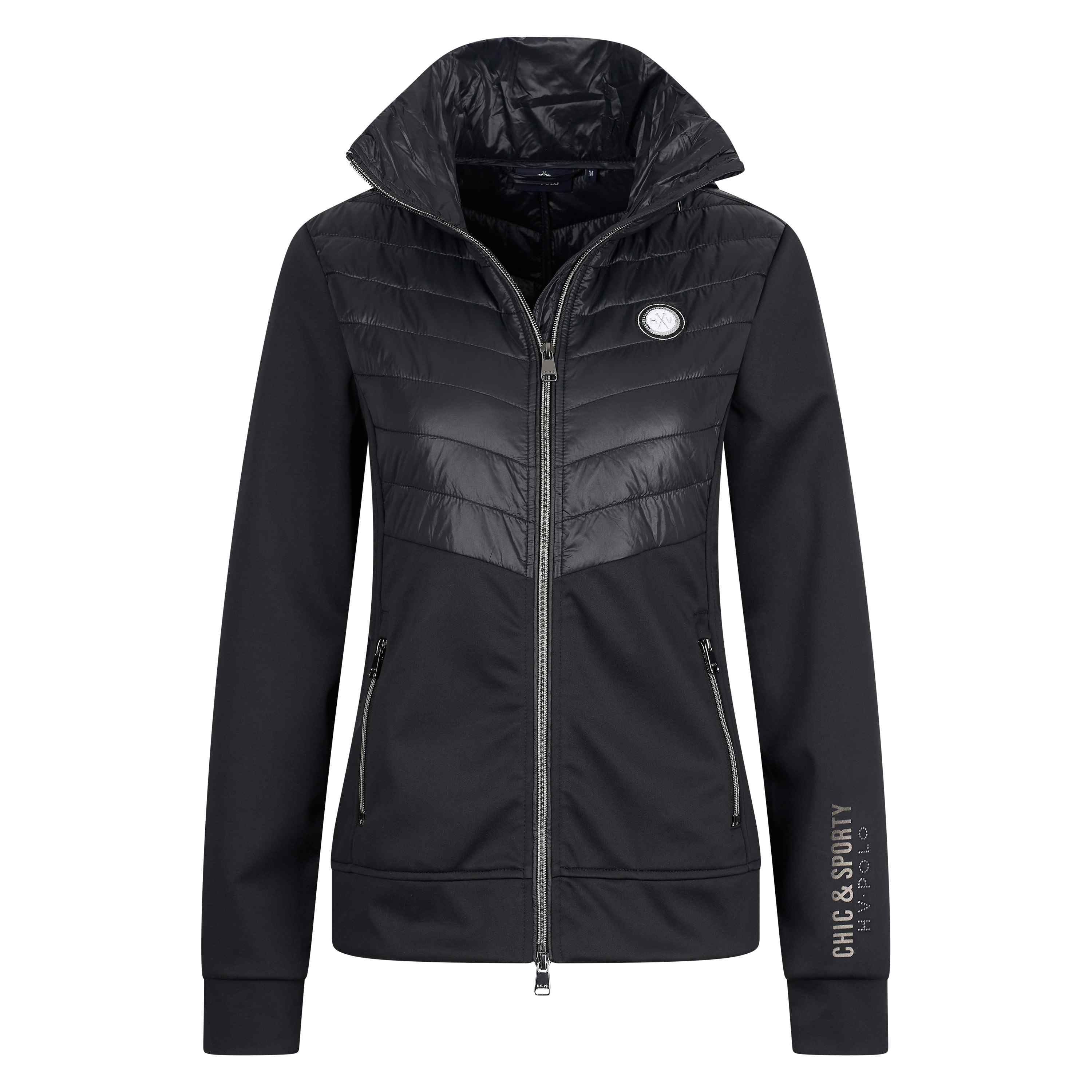 Superzachte microfleece gebruikt aan 2 zijden * Buitenkant van de kraag en voorste lichaamsdelen bedekt met gewatteerd ton-sur-ton nylon * Verborgen capuchon in de kraag * 2-weg ritssluiting aan de voorkant * 2 insteekzakken met ritssluiting * Luxe logobadge op de borst * Gedrukt logo-ontwerp met strass op de mouw