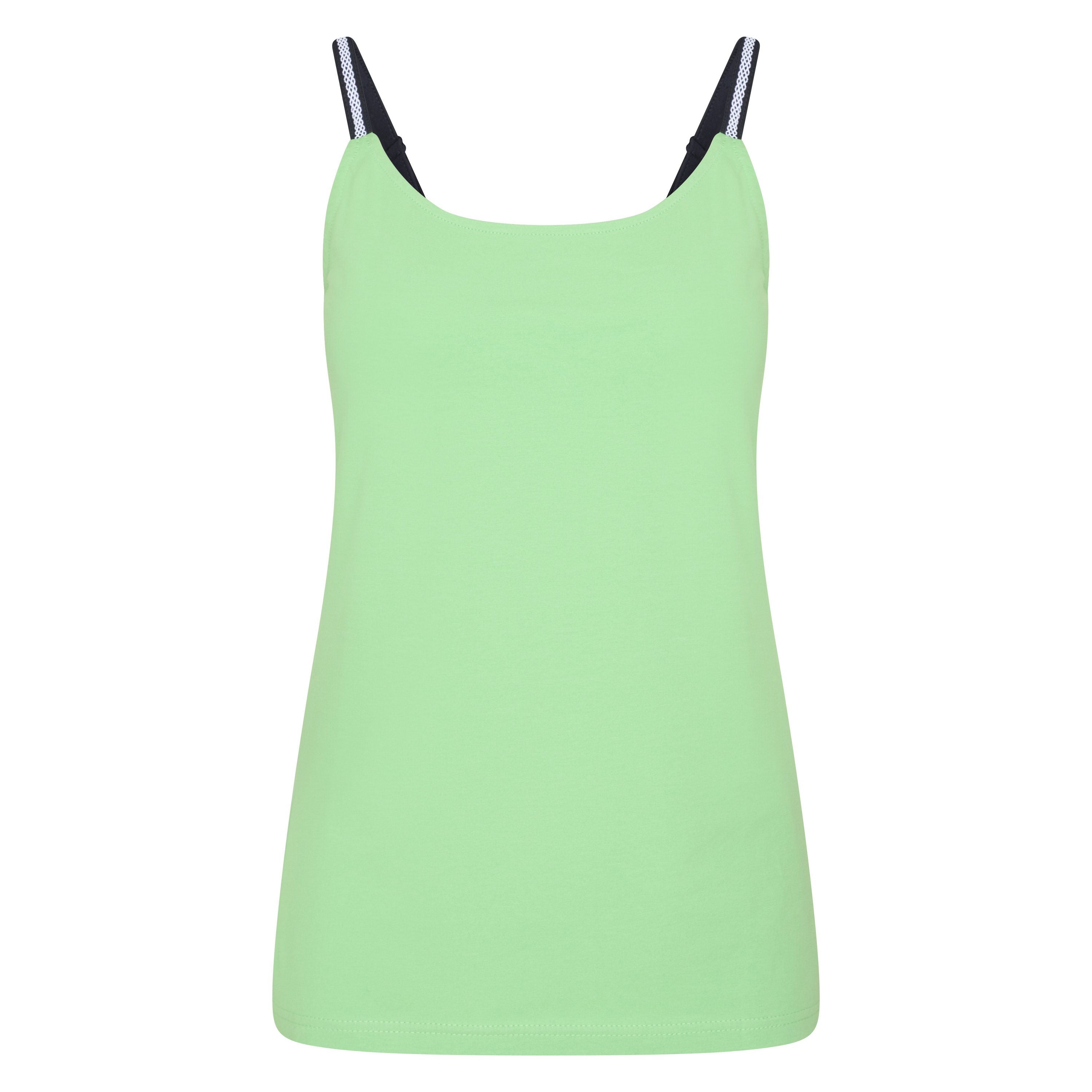Jersey stretch spaghetti top met verstelbare bandjes. Bandjes hebben gedeeltelijk mesh tape erop gestikt. Metalen logoplaat aan de voorkant van de zoom.