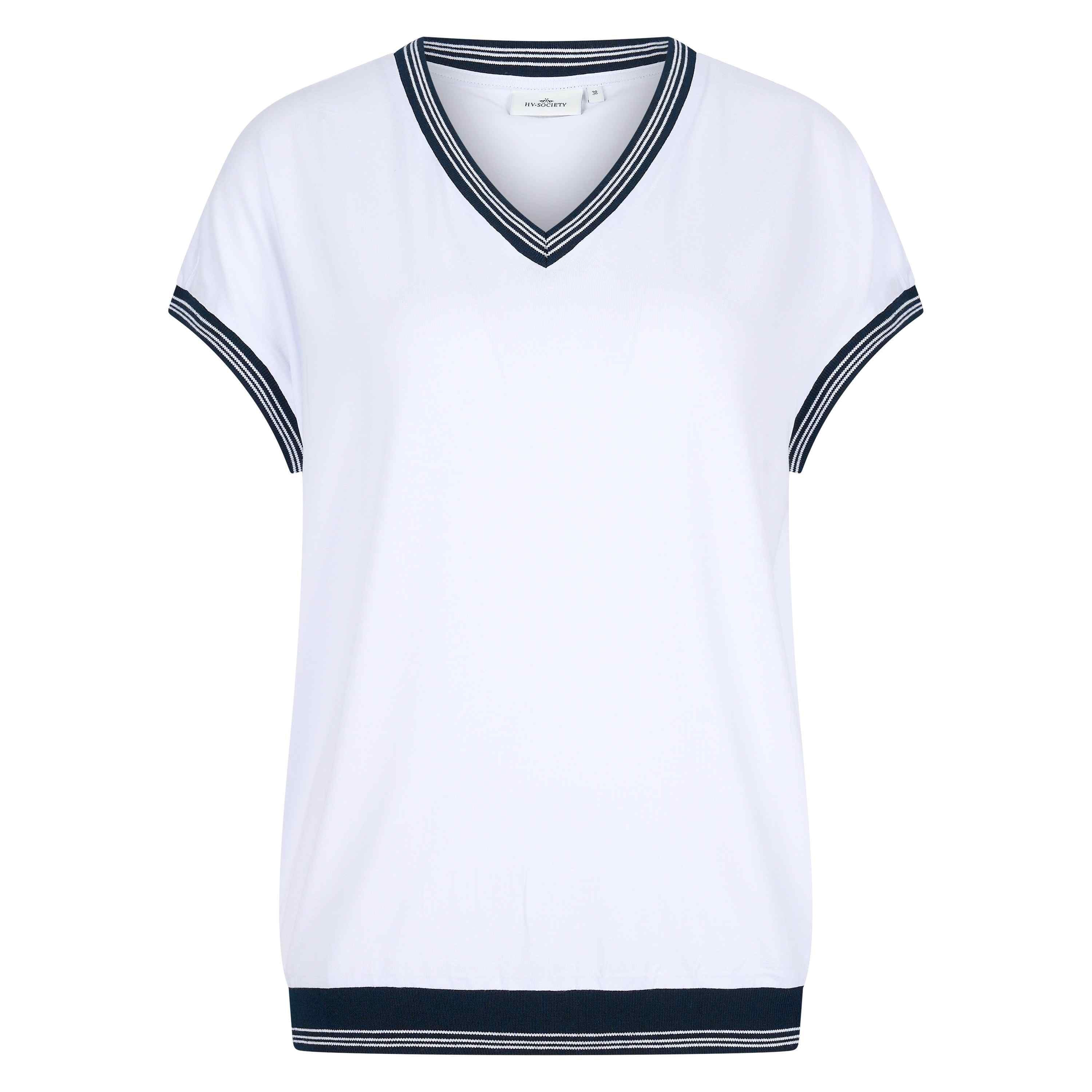 Top met uitsnijding op de mouw * Stretch viscose jersey * Platgebreide rib met contrasterende strepen bij de manchetten en halslijn * Metalen plaatje bij de achterkant van de hals