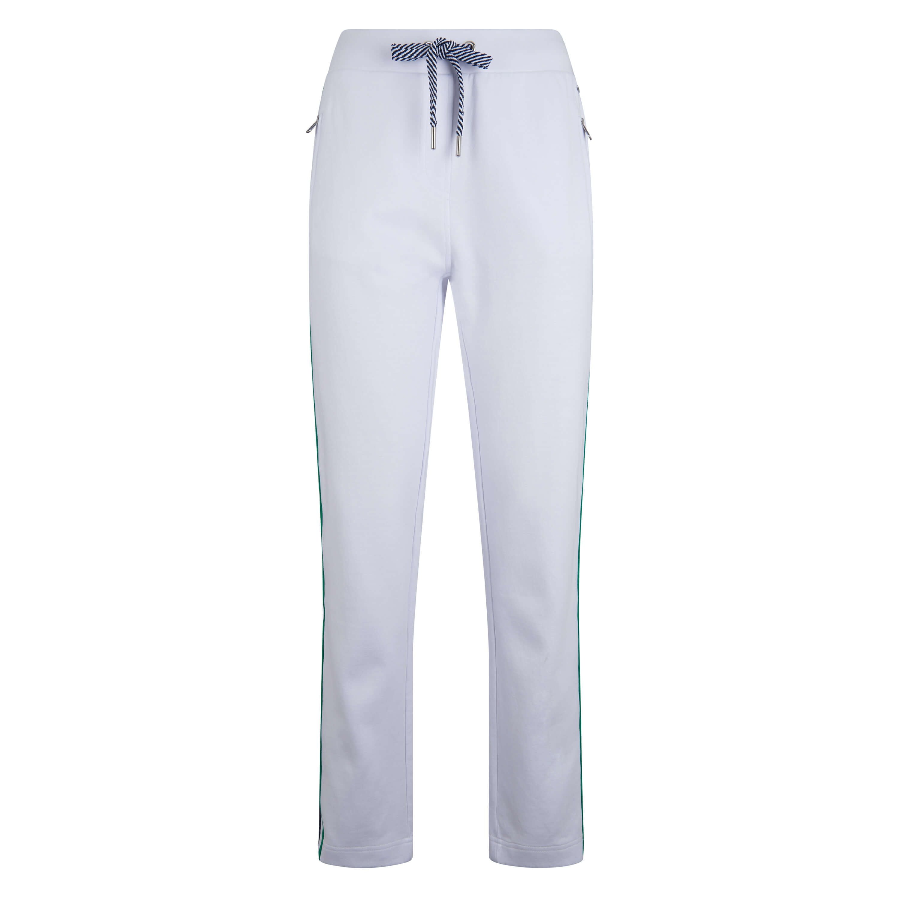 Sportieve maar vrouwelijke puntobroek met gekleurde trekkoord, zakken met rits aan de voorkant, gestreepte full needle tape aan de zijnaden, metalen logoplaatje en logo artwork.