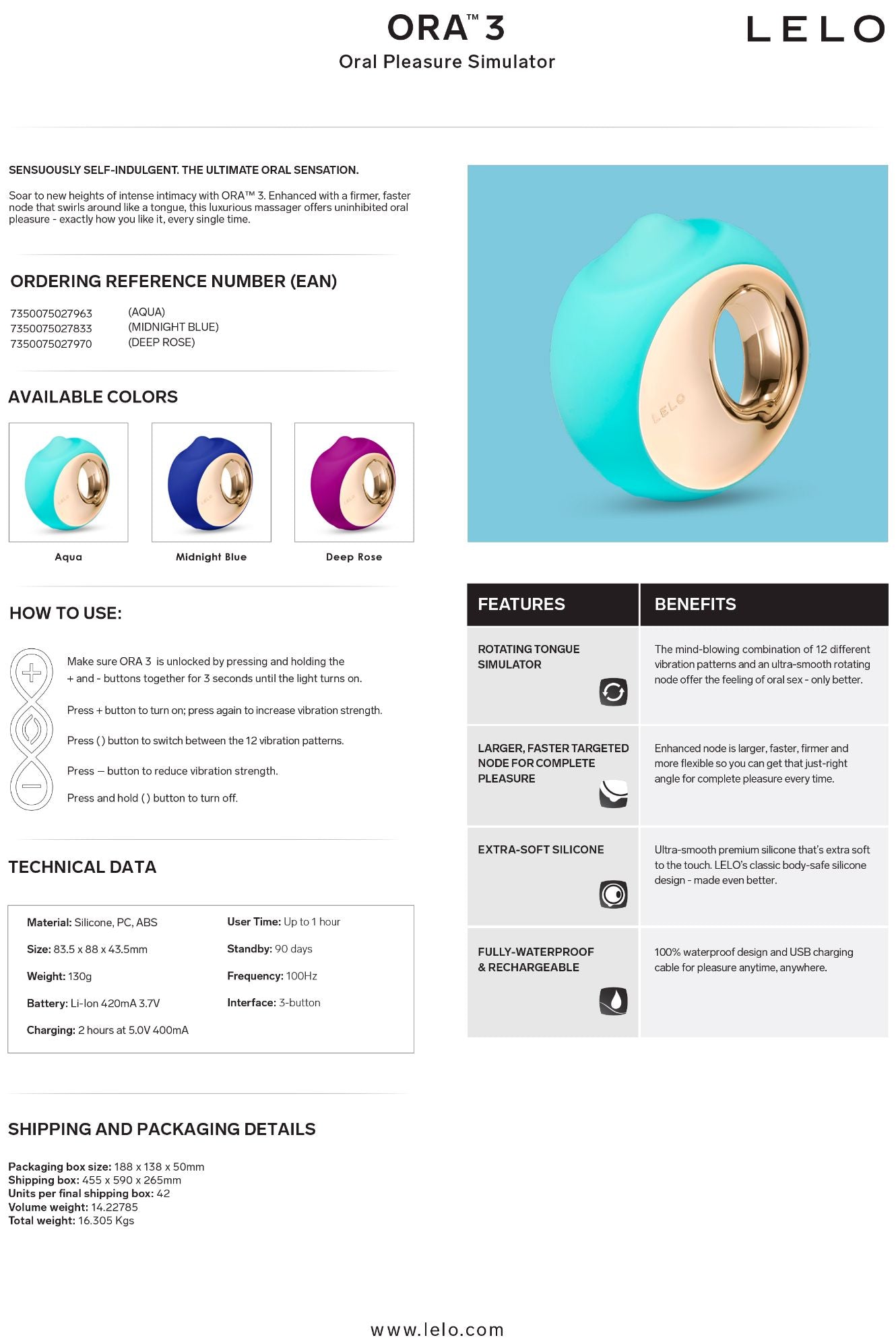 "Pour les femmes qui ne se contenteront de rien de moins qu'un sexe oral primé, ORA™ 3 vous permet de fondre dans un moment de véritable félicité. La technologie PreMotion™ utilise un mouvement de rotation du nub plus ferme et plus précis, pour une stimulation buccale aux sensations réelles 25 % plus rapide. Le nub de plaisir tourne et vibre, comme une langue, mais en mieux. Le simulateur de sexe oral le plus intuitif au monde offre des sensations de sexe oral qui vous feront revenir encore et encore.
