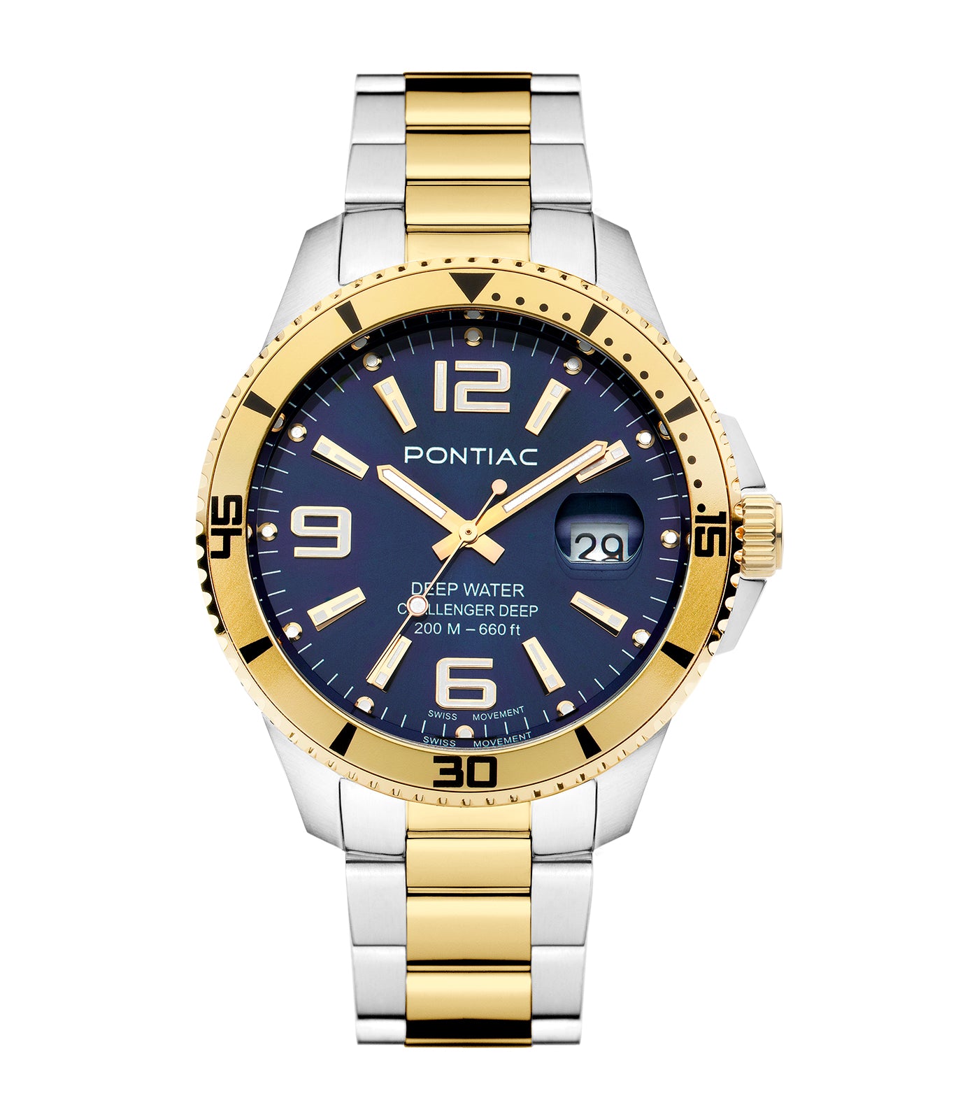 Pontiac - Deep Water - Man - Bracelet Acier / Or Jaune - Cadran Blanc - Boitier Argenté