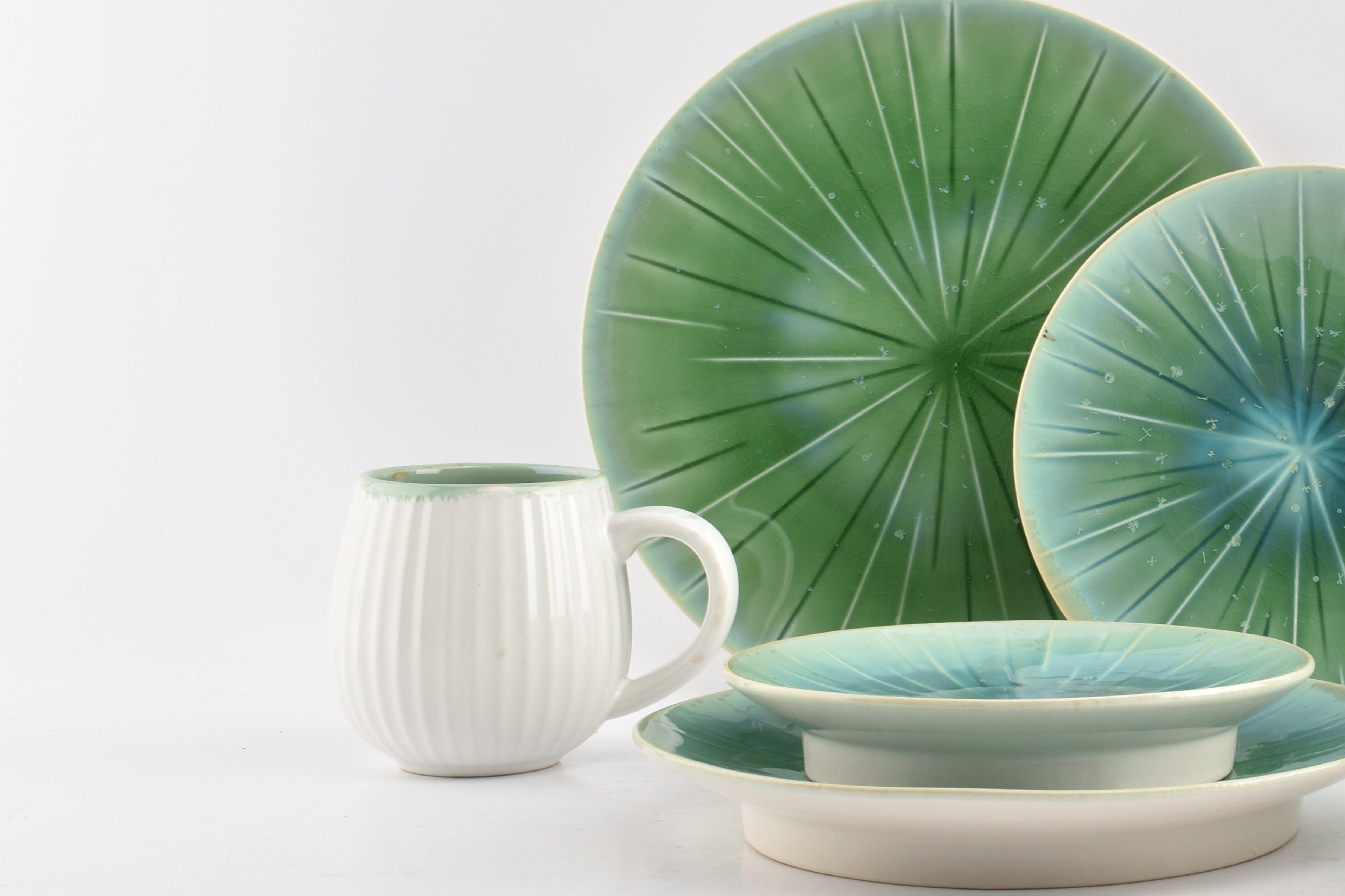 Verdwaal in de elegante verfijning van onze Eclipse collectie, een samenspel van verblindend witte parelkleuren en verfrissende accenten in muntgroen. Elk stuk in deze collectie omhult je in een aura van tijdloze allure, met zijn prachtige reactieve glazuur dat uitwaaiert tot een betoverende irisachtige pracht. Laat je onderdompelen in de intrigerende mix van kleuren en texturen, die een onweerstaanbare sfeer van verfijning en betovering in elke ruimte creëert.