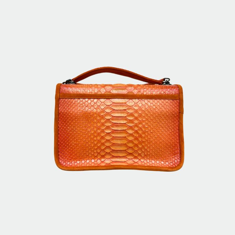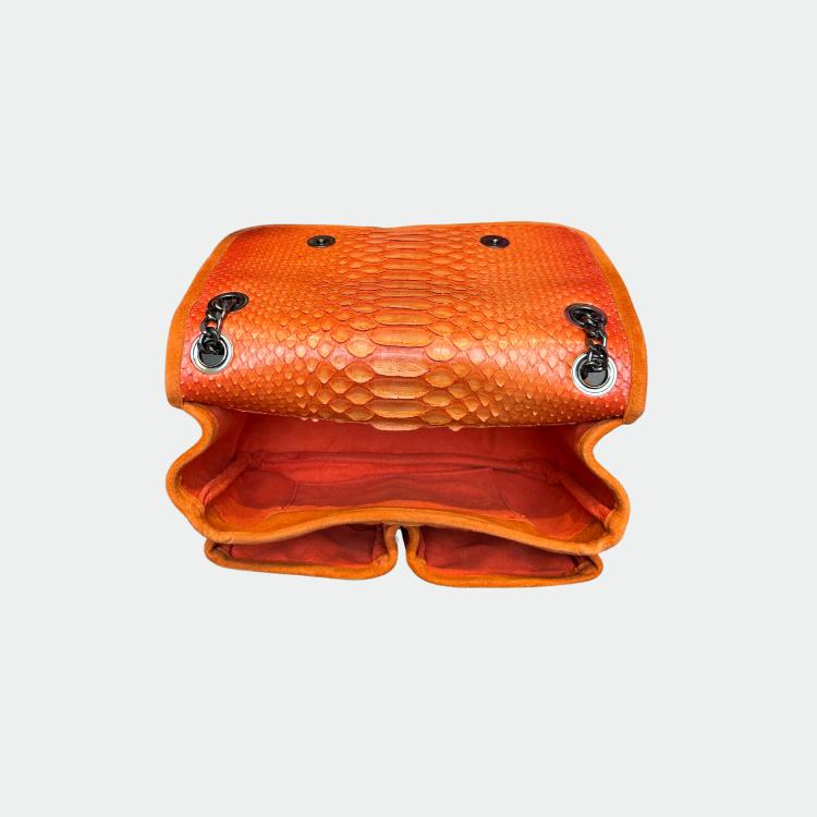 Sac en python, avec doublure intérieure en coton et anses en python et cuir. Un compartiment principal avec une petite poche et deux autres compartiments. Bandoulière métallique.
